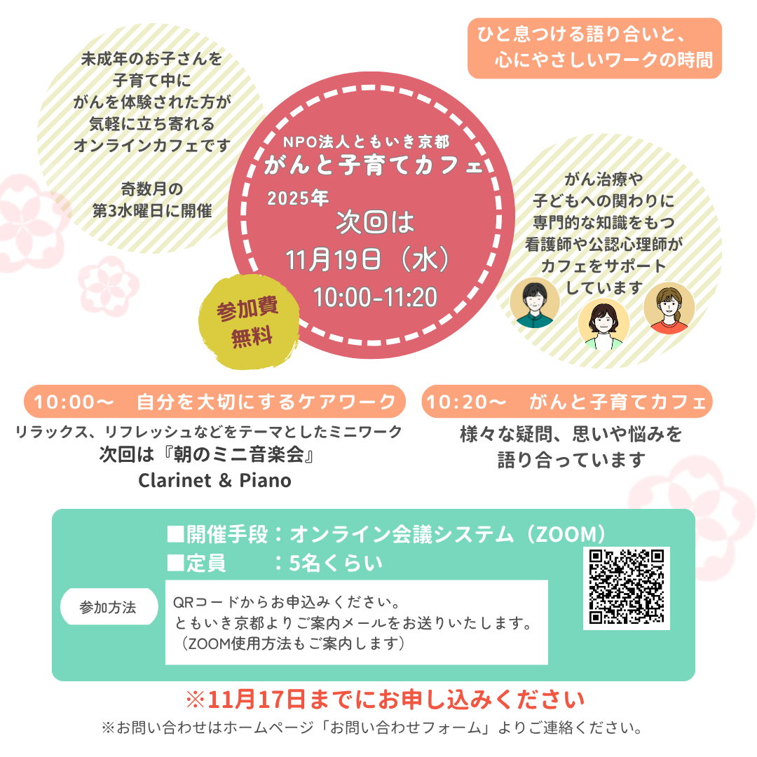 18歳までの子育てをしながらがんと向き合う方が、気軽に参加できるオンラインカフェです。